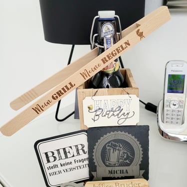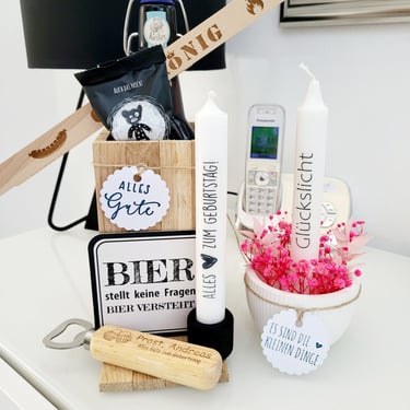 Es ist nicht so einfach mit dem "Richtigen Geschenk" =) ... Kleinkram der zum grinsen verleitet findest Du in dieser Galerie. Es geht ja um etwas kleines, einen Gutschein nett verpackt, die Lieblings - Weinsorte hübsch verpackt, Gläser dazu und Untersetzer... schau mal, was alles möglich ist... Männer sind ja nicht sonderlich "verkitscht" oder auf Schnick-Schnack, aber heute müssen Sie durch. Schlicht uns Aussagekräftig ;)... Los geht´s...